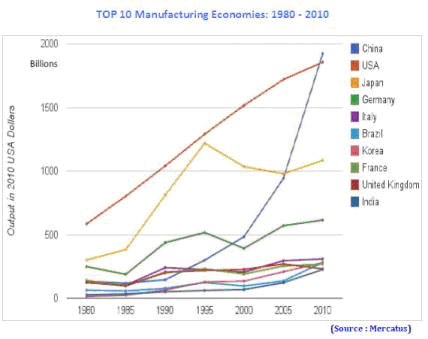 Le phénomène n’est pas nouveau, mais il s’est largement accéléré depuis l’entrée de la Chine dans le l’Organisation mondiale du commerce. Le graphique ci-dessous montre la rapidité des changements intervenus depuis cette date. En 2000, la puissance manufacturière de la Chine dépasse celle de l’Allemagne, mais reste encore très loin derrière celles des États-Unis et du Japon (en gros 3 fois moins importante que les États-Unis et deux fois celle du Japon). En 2005, la Chine double le Japon incapable de surmonter la crise du début des années 90. En 2010, la Chine dépasse les États-Unis. Les Américains avaient quelque peu anticipé ce phénomène puisqu'ils étaient une majorité à penser en 2008-09 que la Chine était devenue la première puissance économique mondiale (il y a un amalgame entre puissance industrielle et puissance économique : la Chine, accélérateur du déclin des États-Unis ?).