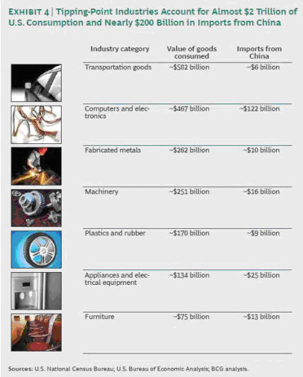 Dans un rapport intitulé Made in America, Again, U.S. Manufacturing Nears The Tipping Point, le cabinet Boston Consulting Group montre qu’à partir de 2015 l’avantage compétitif en matière de salaire de la Chine par rapport aux États-Unis aura diminué de telle manière qu’il sera de nouveau économique rentable de relocalisation la production aux États-Unis.